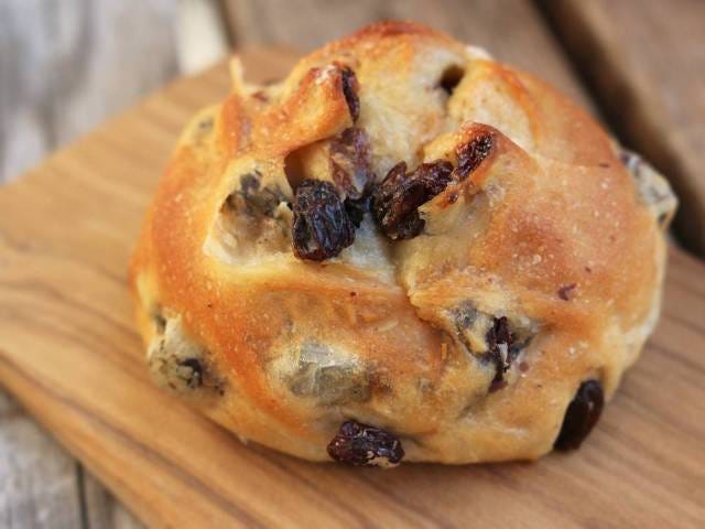 レーズンがごろごろと入った「レーズンボール」(写真上)も人気の品。こちらは食パンと同じ生地を使用しており、ムッチリもちもちの食感が特徴だ。たっぷり入ったレーズンは果肉が厚くジューシー。テニスボールほどのサイズでおやつにちょうどいいと、職場や友人宅への差し入れにまとめ買いする人もいるという。