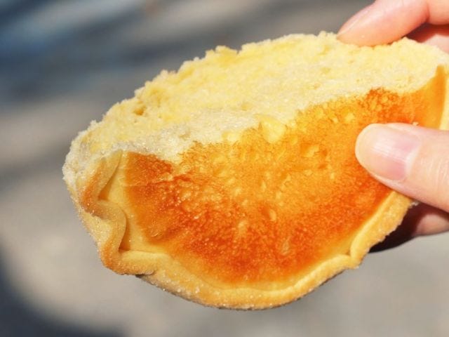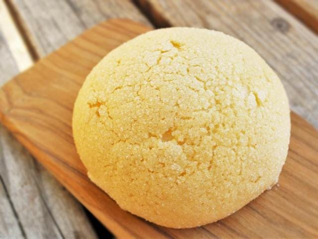 一般的にメロンパンを作る際は、成形したときにクッキー生地で包んでから発酵させることが多いが、同店では土台のブリオッシュ生地だけを発酵させてから、焼く直前に別に伸ばしたクッキー生地をかぶせて焼いている。そうすることで、まわりはパリッと、中はしっとり仕上がるという。