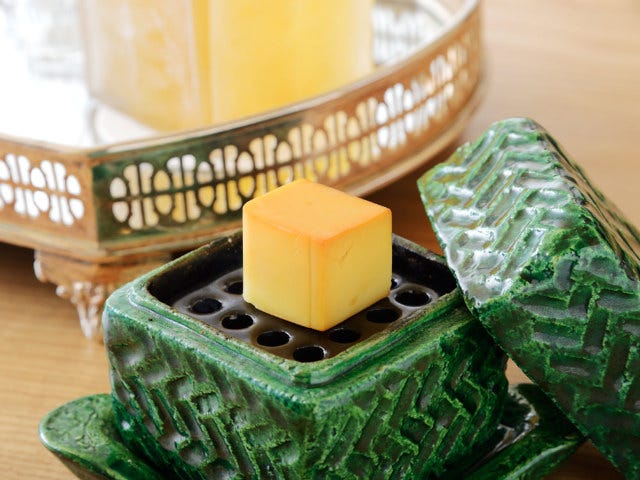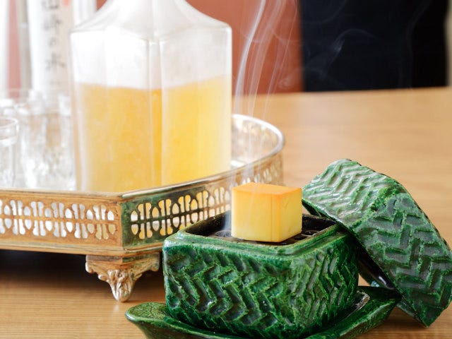 月々、鮮やかに変わる献立の中でスペシャリテといえるのが、箸休めの「チーズの燻製」(写真上)。器は信楽焼きの中川一辺陶。蓋を開けた瞬間、煙とともに燻した香りがふわっと広がる。