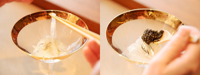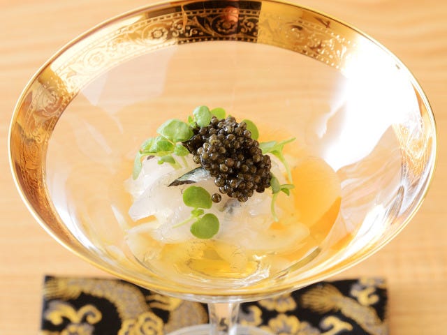 ゴールドの配色も高級感たっぷりだ。「あっさりとした味わい。キャビアものせていますし、シャンパンと召し上がっていただきたい一品です」(鈴木さん)。