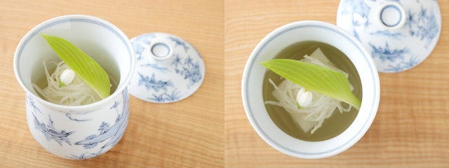 椀物は「はまぐりのお吸い物」(写真上)。具ははまぐりしんじょう。味付けは二年寝かせの北海道・礼文島の昆布にはまぐりのだしと日本酒のみで、はまぐりの塩気と風味が存分に味わえる。ウド、山形のうるいと花柚子をトッピングし、シャキシャキした食感と香りをプラスしている。