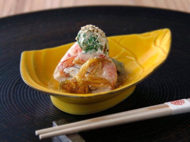 「春の香りを感じる“入口”として楽しんでほしい一品です」(竹村さん)。シャキシャキした生のウド、ぷりぷりのエビなど、食感の異なる食材がマイルドなごまだれで一つにまとまり、口の中に濃厚なうまみを広げていく。素揚げしたフキノトウも春の香りいっぱいで、早くも一品目から幸せな気分になる。