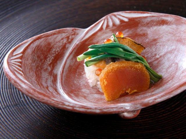 先付で四季の恵みを楽しんでもらった後に必ず提供するのは「季節の飯蒸し」(写真上)。半熟卵、アワビ、イクラ、カラスミが盛り付けられた飯蒸しに季節の風味を添えてくれるのは、山形育ちの庄内アサツキだ。独特な甘さの中に苦みや辛みをはらんだアサツキは、うまみ成分たっぷりのアワビやカラスミとも好相性だ。