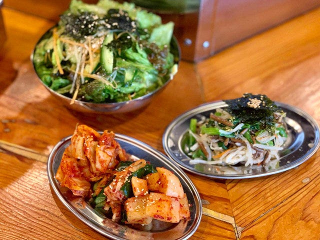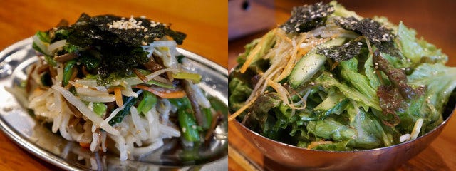 というわけで、やはりこういうシチュエーションなら「とりあえずビール!」、そして「ナムルとサラダ、キムチ!」(写真下)。やはりヴェジタブルファーストでないと!