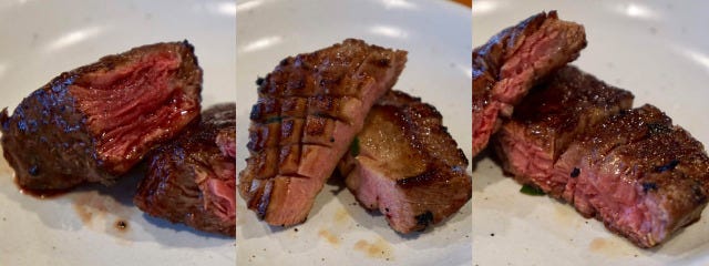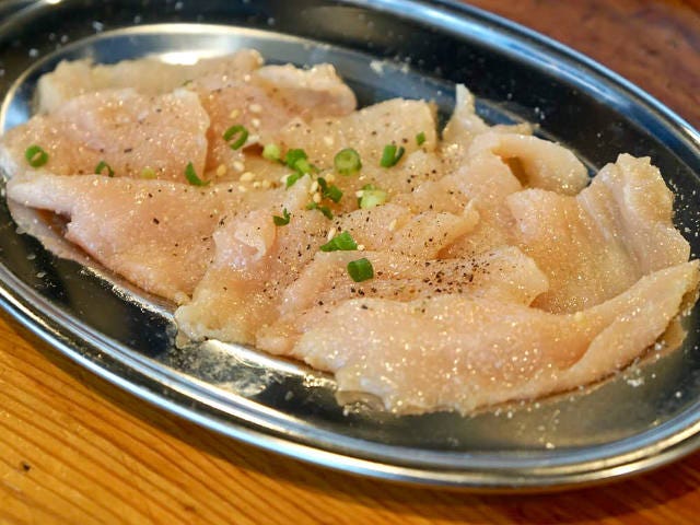 では、お肉に…、おーっと! 塊ドーン! 厚切り盛り合わせが登場! 厚切りタン、厚切りハラミ、和牛カイノミ(写真上)。まさにこれより三役、土俵入り! 迫力がある!!