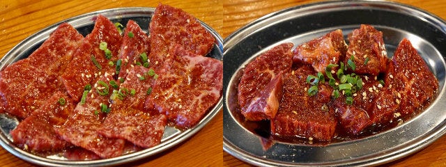 もみダレで味付けたロース(写真上・左)もハラミ(同・右)もやはりロースターカウンター焼肉の醍醐味ですね! 焼き過ぎはいけません、さっと焼いていただきたい!!