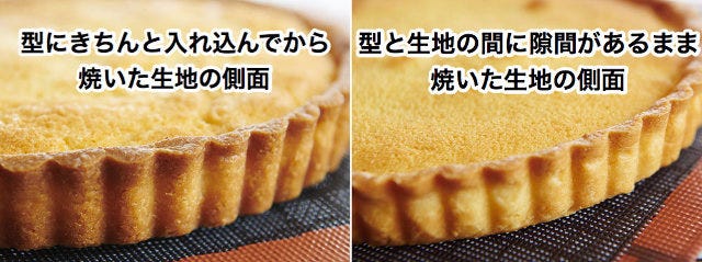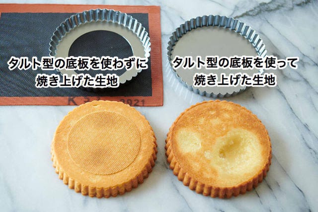 「底取れタルト型の“底板”を使わず、直にシルパンの上に置いて焼き上げるんです! この写真を見れば、仕上がりの違いがわかるかしら?」