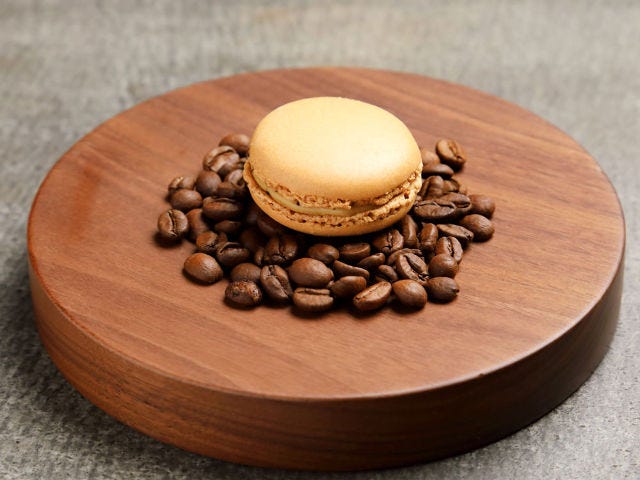 コース中盤に提供するマカロン「スズアコーヒー」(写真下)には、1956年に小田原に創業した自家焙煎珈琲店『スズアコーヒー』のコーヒーをたっぷりと使用している。