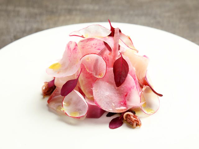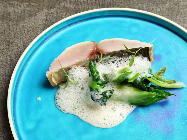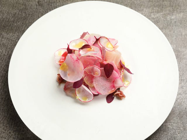 つぼみ菜、ターツァイ、アイスプラントなどの食感の異なる数種の野菜は、いずれも一般的には手に入りにくいものばかり。貝のうまみいっぱいのソースとともに、厚手にカットした鰆に乗せながらゆっくりと味わうのがオツだ。