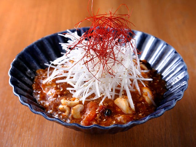 花椒の風味がふわりとしながら、しびれる辛さは控えめ。肉あんに負けず存在感を放つ白子に、トマトの酸味も一体となってうまみを創出してくれる。