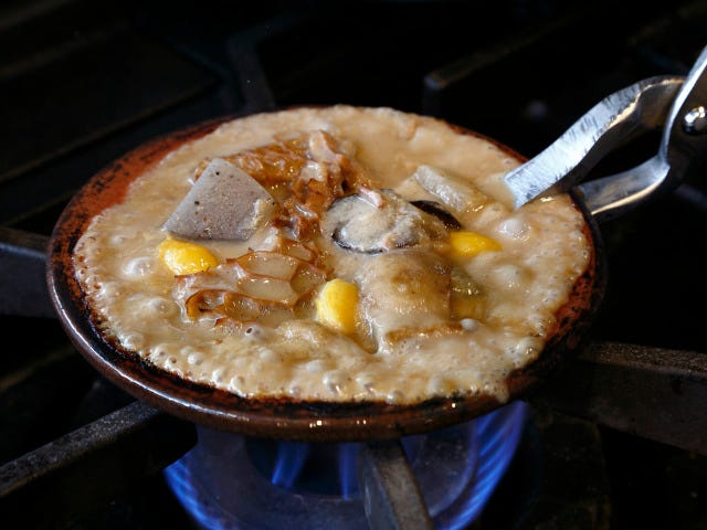 鶏肉とトマトを炒め、花椒(ホアジャオ:痺れるような辛みを持つスパイス)、黒酢などで調味し、生白子を加えて煮込む。麻婆の下にはゴマ油でソテーした白菜が潜む。