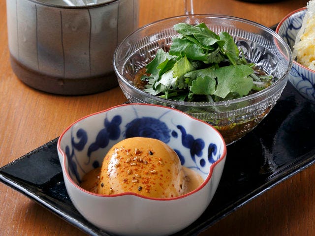 「ウニマヨ半熟玉子」はマヨネーズとヨーグルトに煮切りだしを加えたウニソースをのせて。一口食べれば、ウニと卵黄の濃厚な味わいの中に、だしによる豊かな甘みが顔を出す。