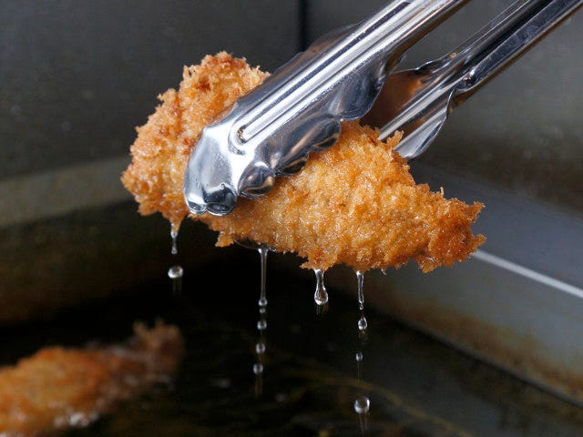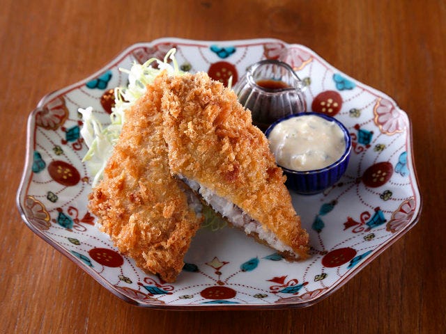 アジは愛知や京都などから仕入れ、1人前に半身を使用。粗めの生パン粉をまぶし、高温の油で3分じっくりと揚げる。その後1分休ませ、余熱で火を通す。