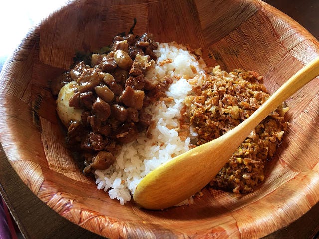 圧力鍋で約15時間煮込んで作られたカレーソースに、煮卵や魯肉飯の肉、高菜、ポテトサラダなどのトッピングが山盛りになっている欲張りな一皿だ。