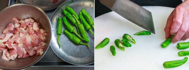 ・鶏モモ肉はさいの目に切る。シシトウはヘタをおとし半分に。