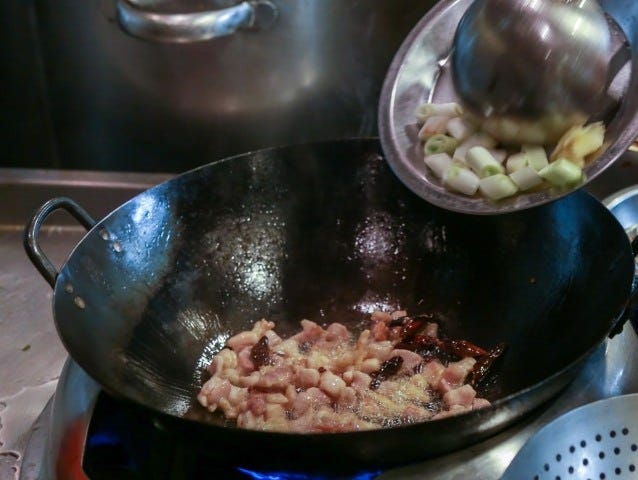 - ・野菜を入れて、炒める時間は30~40秒ほど。ここで唐辛子がきれいな赤黒い色(フーラー)になるように調節する。