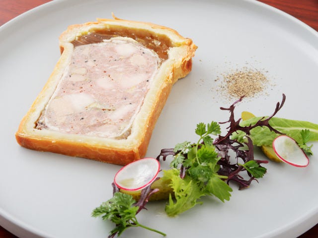 こちらは「ホロホロ鳥 フォアグラ トリュフ パテ・アンクルート」(写真上)。フランス料理の中でも特にクラシックな伝統的料理である。ホロホロ鳥の胸肉やフォアグラ、トリュフで仕上げたパテを生地で包んでこんがりと焼き上げたもの。ねっとりとした食感とコクのある味わいに悶絶。さらに、マデラ酒で風味をつけたコンソメジュレや、バターが濃厚なパイ生地がリッチ感をプラスしている。