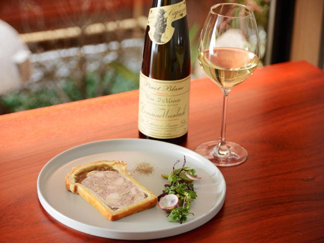 ここでワインが欲しくなるが、ソムリエの中村さんがおすすめするのは、フランス・アルザス地方で生まれた「ピノブラン」(写真上)だ。確かに、「ピノブラン」の柔らかな酸味と丸みを帯びた果実味が、パテの味わいを深めてくれる。