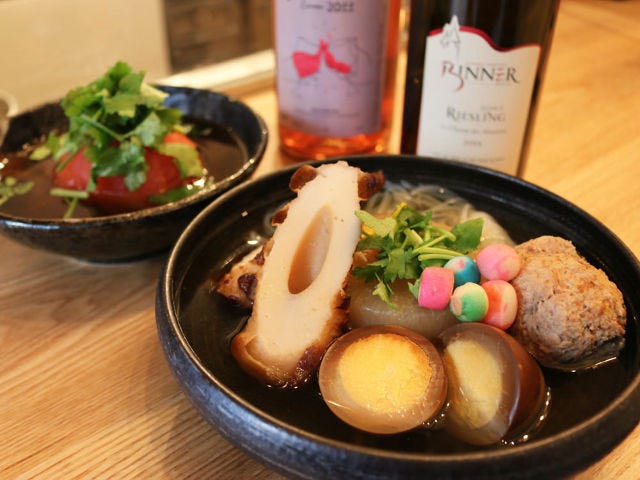 先に紹介した『アウレリオ』の姉妹店としてオープンした『日和(hiyori)』は、透き通っただしで丁寧に煮込まれた「おでん」と、ナチュラルワインのペアリングを堪能できるお店。