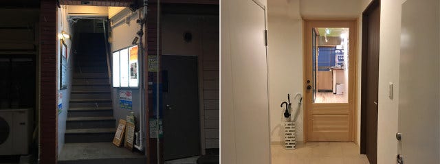 細い階段を2階まで上ると、1つのドアの向うに2つの店。正面に見えるガラス窓がついた木目のドアの向うが、自然派ワインのパラダイス『鯖寅酒昄』だ。