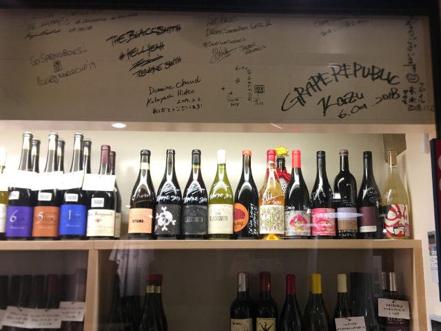 フランスやイタリア、オーストラリア、アメリカ、日本と、世界中の自然派ワインが整列。棚の上には訪れた生産者たちのサインが書かれている。