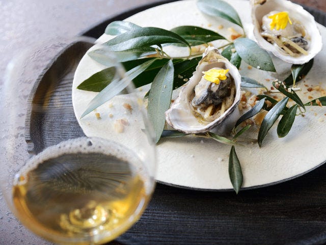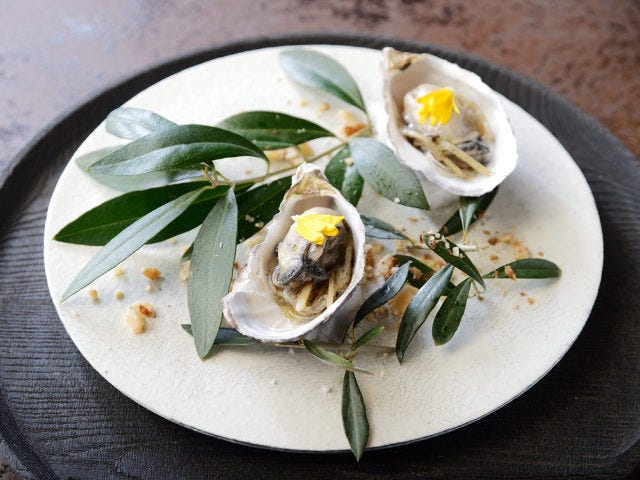 添えられたのは香川県産オリーブの葉。「旬のものとテーマとなる土地のものを組み合わせました。くにさきオイスターはすっきりとした牡蠣本来のおいしさが存分に楽しめます。日本では牡蠣をよくミルキーと表現しますが、このフレッシュな味わいにきっと固定観念がくつがえされるはず。また香川県で訪れた瀬戸内オリーブ園では、オリーブの木を、牡蠣の殻を撒いてミネラル分を補い育てていたのもこの組み合わせのヒントとなりました」と東さん。