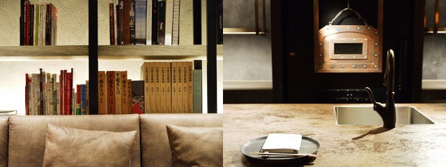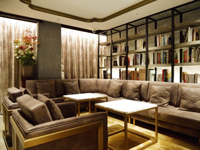 すると、ガラス戸の奥には書棚とレザーソファーをゆったりと配したノーブルなラウンジスペースが広がり、そのギャップが好奇心を刺激する。