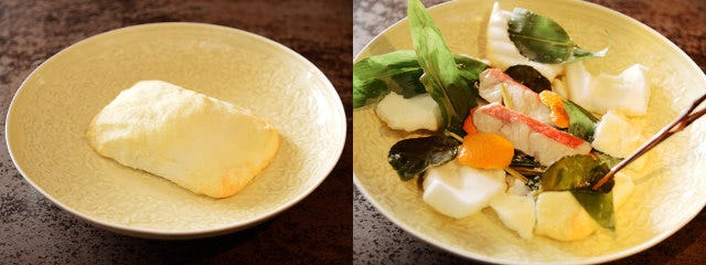 「金目鯛の塩釜」(写真上)は、金目鯛を柑橘類やハーブとともに竹の葉で包んで火を通し、塩釜を割ると、香川・愛媛の土地の香りがふわっと広がる仕掛け。こちらを銘々皿に盛り付ける。