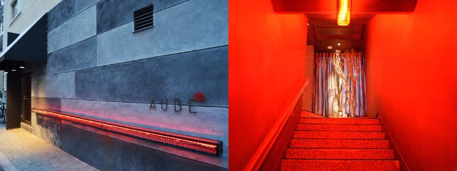 隠れ家を思わせるような路地に面したささやかな入口から、「AUBE=暁」をイメージした赤い照明に導かれて2階へ。