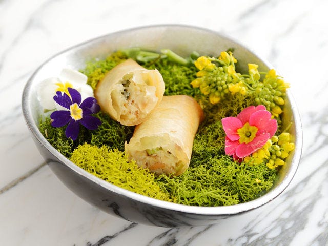 たとえば春、青森県をテーマとした月の前菜は「トゲクリガニと花わさびの春巻」(写真下)。