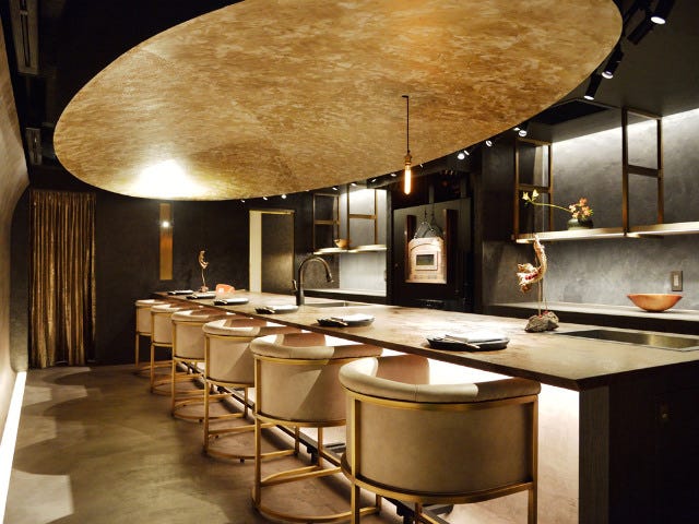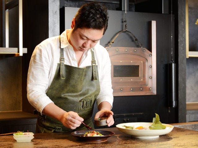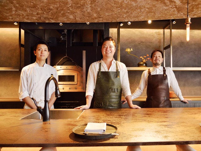 『AUBE』では大皿でシェアするスタイルではなく銘々盛りに仕立てたコース料理を提供。ラウンジスペースで前菜を楽しんだあとカウンター席へ移り、全10品ほどを堪能する趣向だ。