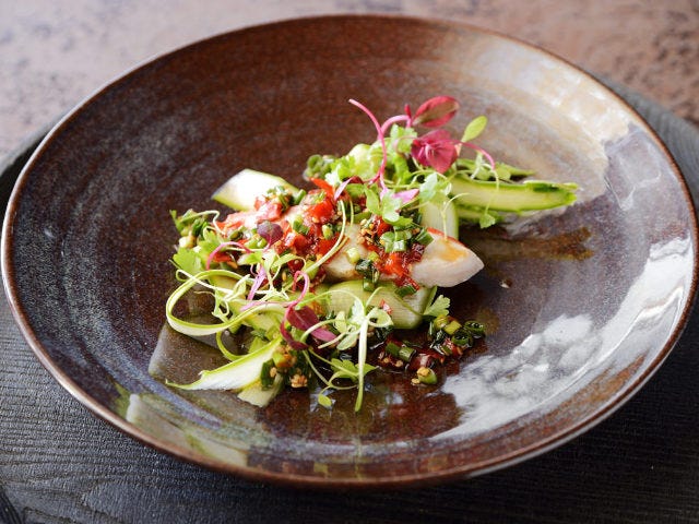 タレは陳皮をつけこんだ醤油に発酵唐辛子とネギを加えたもので、甘い鯛に爽やかな風味とピリッとした辛みが加わり食欲を刺激。下に敷かれた香川県産アスパラガスのスライスに絡めて最後まで味わい尽くしたくなる。マイクロハーブの辛みとシャキシャキ感もアクセント。