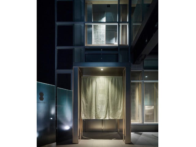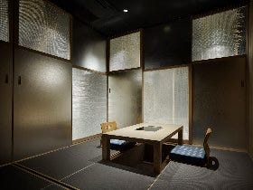 通路に並ぶ扉のひとつを開けて個室に入る。テーブルと椅子はやさしい色の白木で、ライトに照らされ内装にあしらわれているガラスと銀箔がキラリと輝いている。同店は、日本ならではの芸術性と品を備えながら、洗練されたモダンな空間の、お忍び感ある大小の個室が充実している。デートや接待、慶事の集まりなど、大事な会食の席にぴったりだ。