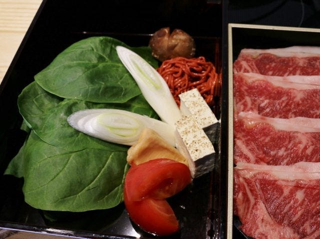 肉の左側にはすき焼き用の食材がズラリ。ほうれん草、白ネギ、トマト、椎茸、焼き豆腐、赤こんにゃく、丁子麩(ちょうじふ)と、種類も豊富だ。全て日本国内からその時季においしく、すき焼きに適したものを選定している。