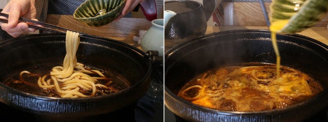 肉を全て平らげたところに「さあ、〆に入りましょう」と、うどんが投入され、卵とじに! 肉のうまみが溶け込んだ割り下でいただくうどん、お腹がいっぱいと思いつつもペロリと完食してしまう。