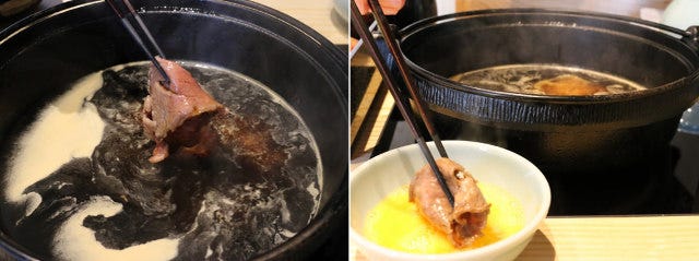 特徴的なのは、八寸にも入っていた“赤こんにゃく”であろう。これは中嶋氏の故郷・滋賀県の、近江八幡市の名物だ。プリッとした食感は白滝よりも歯ごたえがあり、鍋の彩りにも一役買っている。