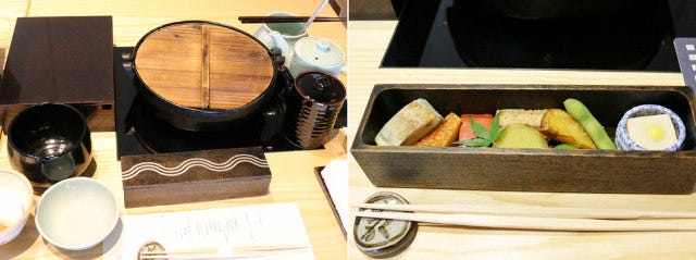 夜のコース「熟成和牛すき焼き会席」には写真左・手前の箱「八寸」が付く。フタを開けると、左から鯖の松前寿司、玉子チーズカステラ、赤こんにゃく土佐煮、鶏味噌松風、新丸十蜜煮、インカのめざめから揚げ、若桃甘露煮、紫花豆蜜煮、枝豆塩茹で、胡麻豆腐が並ぶ。