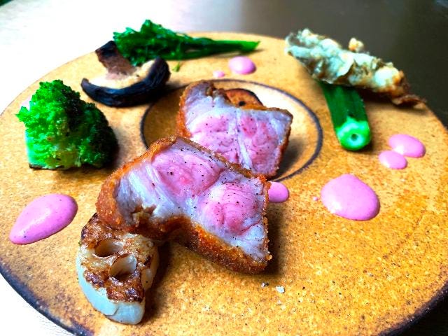 料理はアラカルト(500円~)もあるが、宮武シェフの料理の真髄を味わいたいなら、4,500円のおまかせコースがオススメ。「低温調理のポークカツレツ」(写真上)は大きな塊肉のまま55℃という低温で約5時間ゆっくりと加熱。1人分ずつカットして自家製パン粉で揚げ焼きしているため、赤身部分は完全に火が通っているのに、たっぷりの肉汁を抱いてしっとり、やわらかだ。
