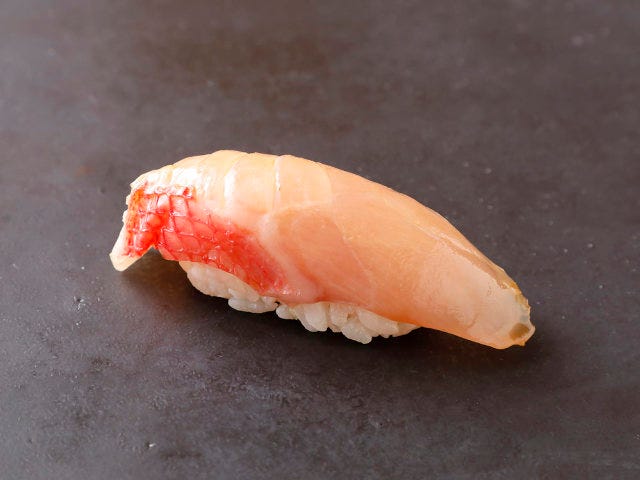 派手な味の金目鯛を実直に感じる、ストレートな味わい。赤酢を2種類使った万能型のシャリともよく合う。