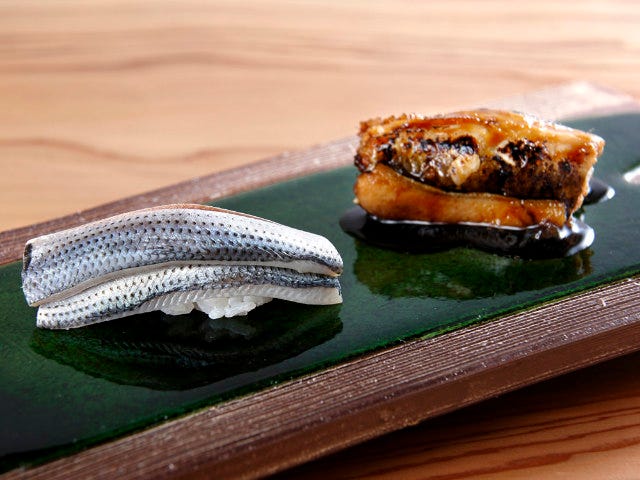マグロは脂が豊かな10~11月に獲れたものだけを使用。これが一級品の味わいで、驚くほど細かい包丁目の入った「大トロ」はシャリと合わせて口に入れるとサッと脂がほどけ、極上の口当たり。また「小肌」はネタの具合に合うように白酢と赤酢をブレンドしたシャリを使っており、食べるとすっきりした脂とじんわりした甘みが口いっぱいに広がる。