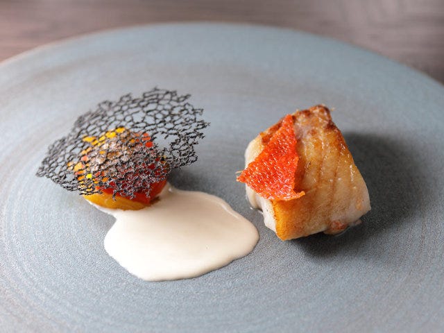 同店では、“伝統と革新”をテーマに、和と洋2本仕立ての料理をランチとディナーで提供。洋食コースのメインとして登場した「本日の鮮魚 若ぶどう“ヴェルジュ”とパプリカ」(写真上)は、そのテーマを伺える良例だ。