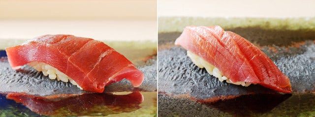 「マグロ」は、赤身、中トロ、大トロの3種が食べ比べできる。どれも繊維を切るように刃を入れて筋感を残さないように仕上げられているため、赤身の濃いうまみ、トロの甘さなどがストレートに伝わってくる。