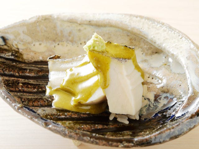 メニューは25,000円~のおまかせのみで、18時~と20時半~の2回転制となっている。コースの序盤に出る「鮑と肝ソース」(写真上)は、『鮨 よしたけ』の人気メニューをアレンジした一品。