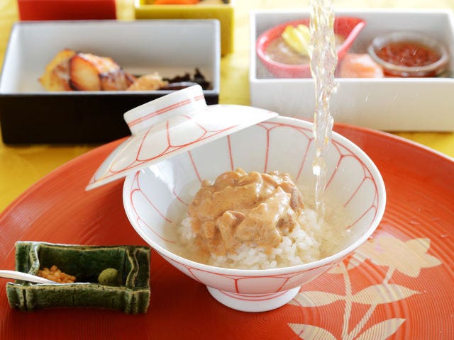 そして、ぶぶあられやワサビ、イクラ等をのせ、白だしを加え、蓋をして1分ほど蒸らしていただく。