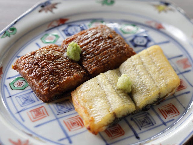 そして手前は、本物のうなぎの白焼き。パリッとした表面の中は、脂が乗ってふっくらとしており、その風味を山葵が爽やかに引き立ててくれる。このような遊び心あふれる趣向も魅力のひとつ。