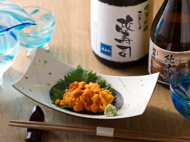 ▲「海水うに」は、小樽の地酒「宝川」とよく合う