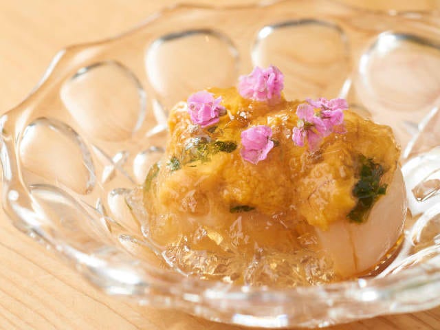 ▲コースの一例。真空調理した帆立と雲丹のジュレ掛け