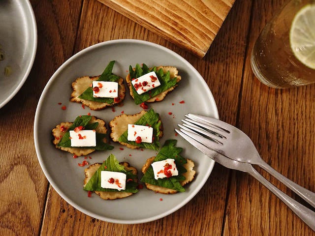 「久保田」を作る『朝日酒造』がある新潟県長岡市の特産品「かぐら南蛮味噌」を使ったホットドック「CONTAINER DOG~KUBOTA SAKE BARバージョン~」(写真上)や、『朝日酒造』の酒粕に漬けたクリームチーズをいぶりがっこに載せた「いぶりがっこ酒粕クリームチーズ」(写真下)など、新潟の特産品を活かしたフードも充実。