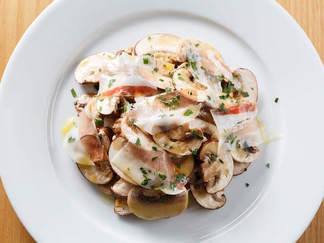 フレッシュなブラウンマッシュルーム・ホワイトマッシュルームを、オリーブオイルと塩、ビネガーだけでシンプルに味付けし、アクセントとして自家製のラルド(豚の背油を塩漬けしたもの)を添える。