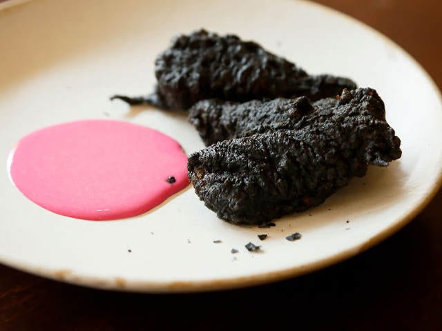 そのビジュアルに驚くのは「真鱈のベニエ(フリット)自家製ビーツのマヨネーズ」(写真上)。黒色の正体は竹炭で、衣は卵・小麦粉・ビールに少量の竹炭を混ぜて作られる。